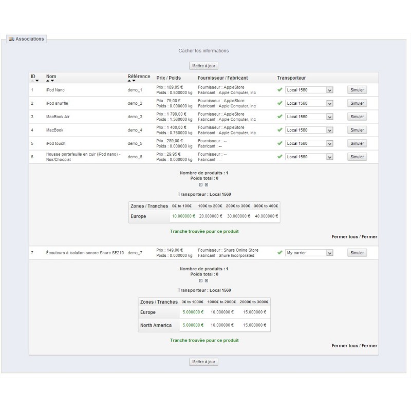 Vous pouvez télécharger votre fichier .xls contenant vos associations Produits / Transporteurs afin de mettre à jour en un clic vos associations.